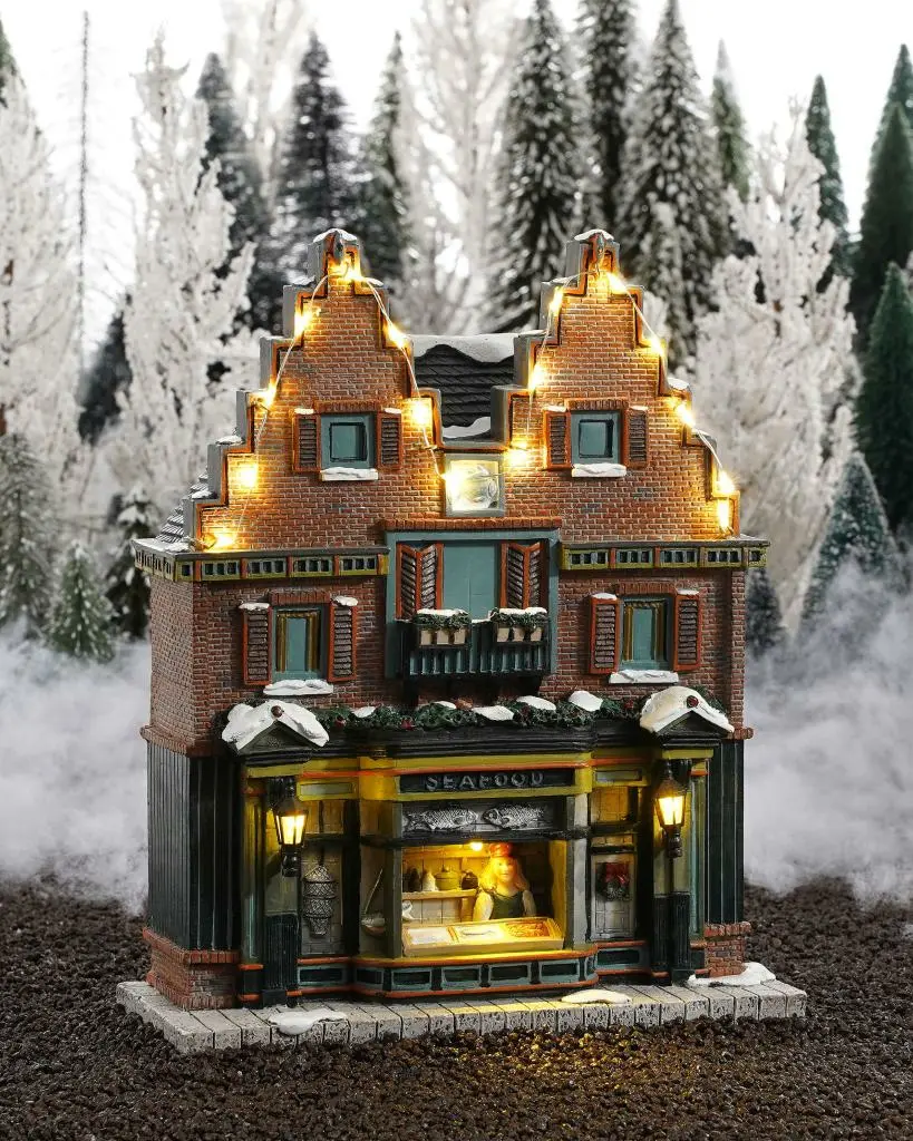 The Luville Molendam Seafood shop is part of the Luville Molendam collection. The product belongs to the village theme Luville Molendam. A Christmas village in this style is certainly not complete without the Luville Molendam Seafood shop, this product fits perfectly into your Christmas village.